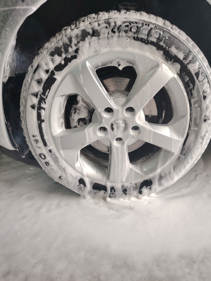- "A close-up forensic view shows a vehicle's front passenger side wheel, completely coated in dense white cleaning foam" by FM-X84Fh1, licensed under CC BY 4.0