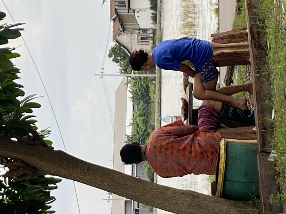 Two individuals are seated under a tree at an outdoor roadside location in Kalitengah, Indonesia
