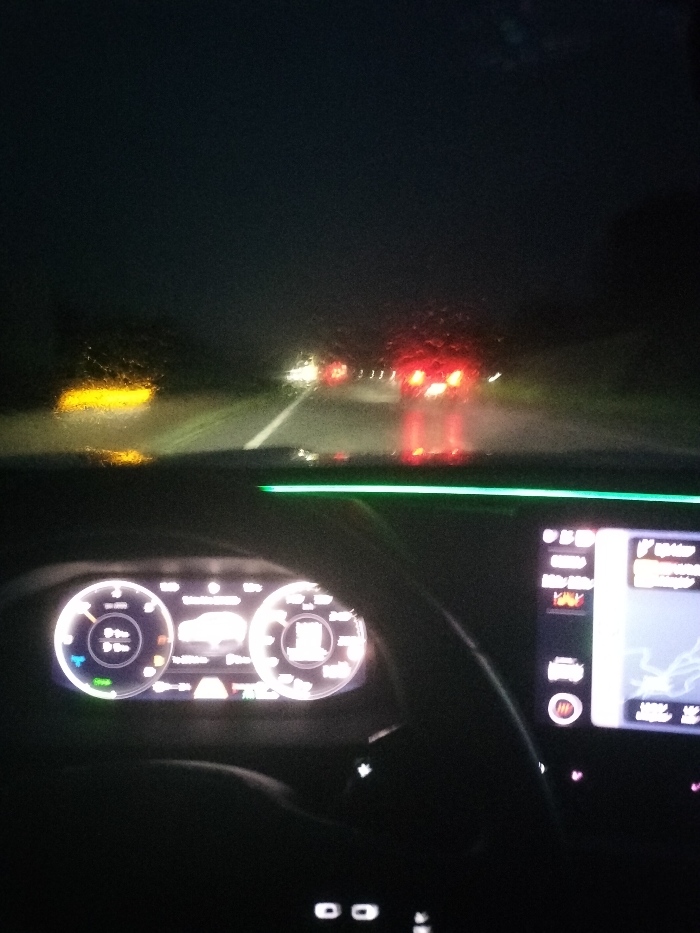 A nighttime scene from inside a vehicle. Rain streaks obscure the windshield's view of the road ahead, illuminated by headlights and taillights of other cars. The dashboard is brightly lit, displaying digital gauges and a navigation screen. A green LED strip accents the dashboard's edge. The steering wheel is in the foreground, partially obscuring the digital dashboard. The road markings are dimly visible through the rain.