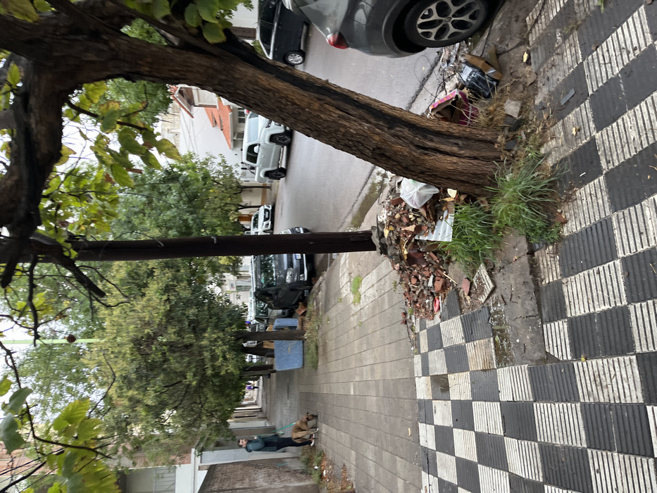An urban street scene in Bahía Blanca, Argentina, is depicted under overcast conditions with visible moisture on the ground. The foreground features a large tree trunk on the right, leaning towards the street. At the base of this tree and extending onto the sidewalk is a pile of debris, including broken red bricks, corrugated metal, various plastic bags, and discarded items, with patches of green grass growing amidst it. The sidewalk in the immediate foreground exhibits a black and white checkered paving pattern, which transitions to plain grey rectangular slabs further along. Some paving stones are missing or displaced, revealing soil and small puddles. A dark grey vehicle is partially visible on the far right, parked parallel to the curb. Further into the scene, a utility pole stands vertically. The wet street is lined with parked vehicles, including a dark grey sedan, a white pickup truck, and a white sedan, with additional cars visible in the distance. Two blue mattress-like objects are propped against the curb on the left side of the street. On the left side of the sidewalk, an adult male, dressed in dark clothing, walks a medium-sized dog on a green leash. The dog, with brown and black patterned fur, has its head lowered, appearing to sniff the ground. In the background, residential buildings with varying facades and roof types are visible along both sides of the street, interspersed with trees.