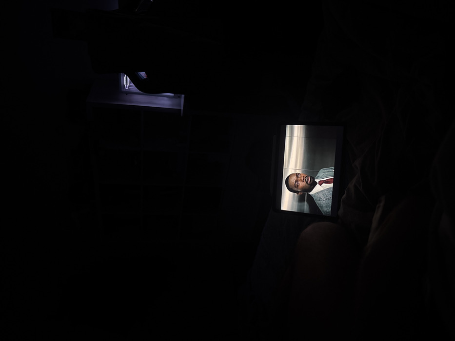 The scene depicts the interior of a darkened room, located in Bratislava, Slovakia. A digital screen, consistent with a tablet or laptop, is centrally positioned in the lower half of the frame, displaying video content. The screen shows a medium close-up of a dark-skinned male individual with dark hair and a short beard, wearing a grey patterned suit jacket, a white collared shirt, and a dark red tie. He exhibits a serious expression, looking towards the viewer's left. The background behind him appears to be a reflective, light-colored metallic surface, likely an elevator interior. In the lower left quadrant, a portion of a human limb, consistent with an arm or shoulder, is dimly discernible, indicating a person is reclined and observing the screen. The upper right quadrant contains a window or opening emitting a faint, cool-toned blue-violet light, with a dark, undefined silhouette partially visible within the illuminated area. Ambient light in the room is extremely low, with the screen providing the primary illumination.