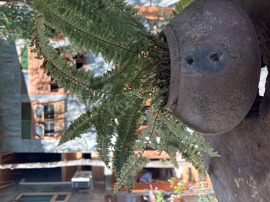 A weathered clay pot, riddled with holes, overflows with delicate green ferns. The pot is supported by a rough, hewn wooden surface. The background reveals a blurred, multi-story building with varied window designs and a glimpse of outdoor elements. The composition is framed by the fern's foliage, directing focus to the textured pot and the intriguing play of light and shadow. The photo appears rotated.
