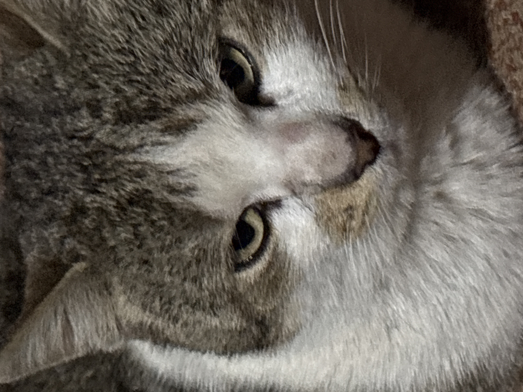 - "A close-up, head-on portrait shows a domestic cat with predominantly grey-brown tabby markings on the upper head and ears, contrasting with significant white fur on the muzzle, cheeks, and a central facial blaze" by FM-UCF3H3, licensed under CC BY 4.0