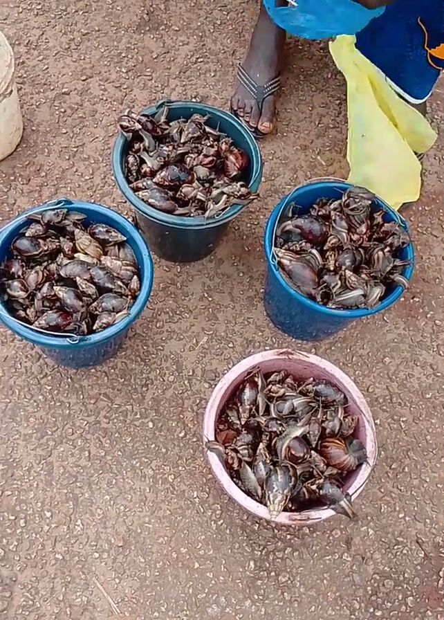 A high-angle shot shows a person standing near four buckets filled with what appears to be snails or similar mollusks on a red-brown surface