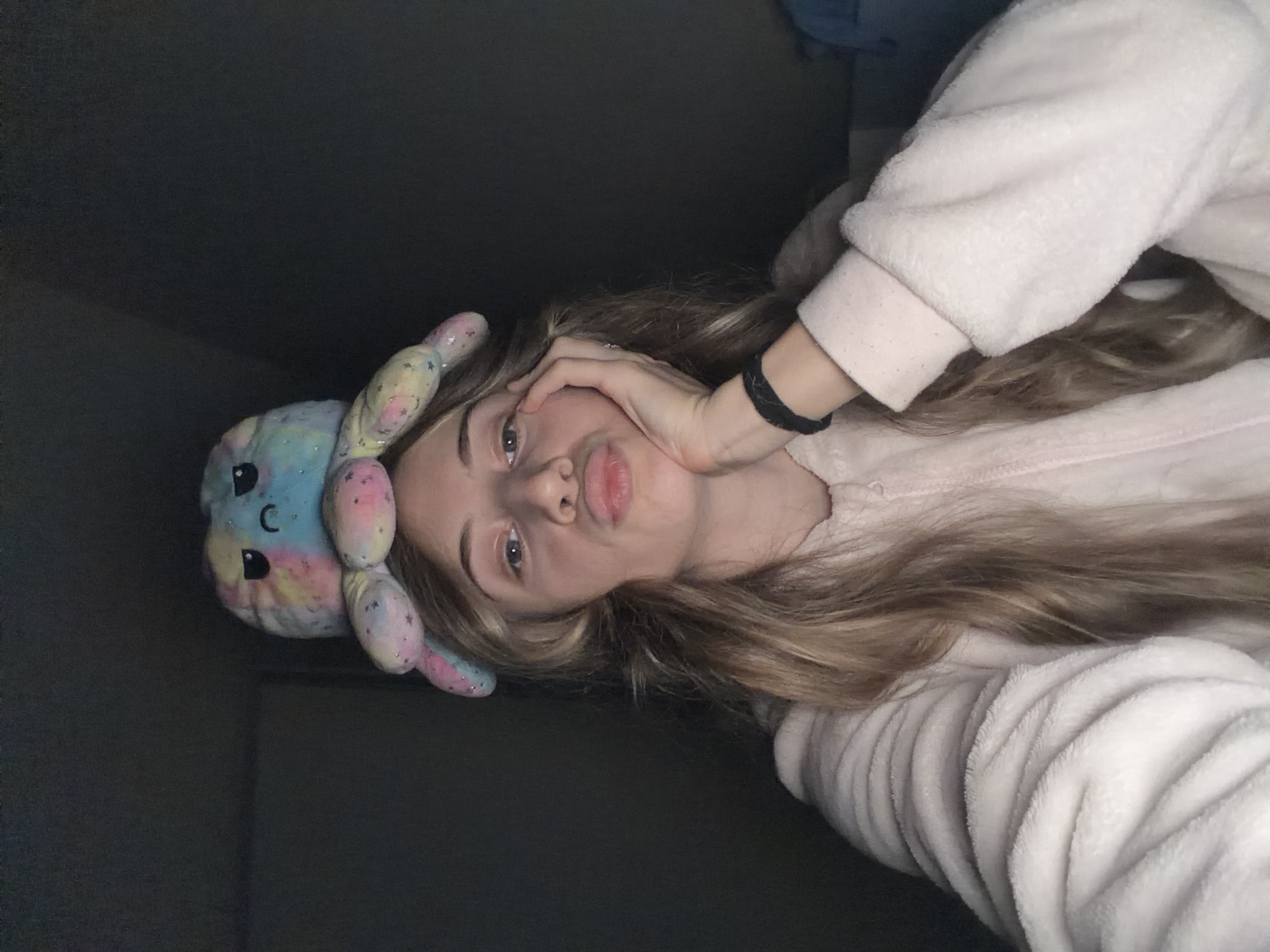 A young woman lies on her side, wearing a light pink, soft fleece sweater and a colorful plush toy with multiple limbs attached to her head. Her blonde hair is partially covering her shoulder and chest. Her left hand rests on her face, and she is looking directly at the camera with slightly pursed lips. The background is dark, suggesting an indoor environment. There is no visible evidence to suggest that this image was taken in Plovdiv, Bulgaria, or any other location.