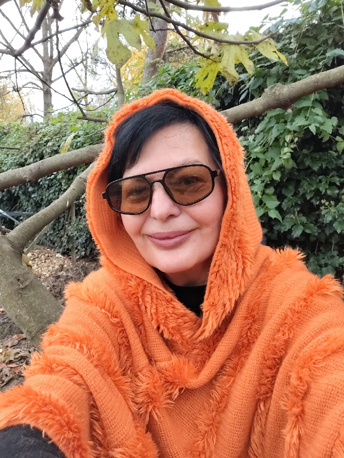 A medium close-up, selfie-style photograph depicts an adult female positioned centrally within an outdoor green space in the city of Strasbourg, France. The subject has short, dark hair and wears dark-framed aviator-style sunglasses with amber-tinted lenses. Her lips are a light pink/nude color, and she displays a subtle closed-mouth smile, gazing directly at the camera. She is dressed in a bright orange hooded garment, appearing to be a poncho or sweater, characterized by a knitted texture interspersed with vertical strips of shaggy, faux-fur-like material. A black garment is visible underneath. The background consists of natural elements: dense green foliage forms a wall behind and to the right of the subject, while bare or sparsely leafed tree branches, some with yellowed leaves indicative of autumn, crisscross the upper and left portions of the frame. The ground visible on the far left shows scattered fallen leaves and light-colored debris. The scene is illuminated by natural, diffused daylight.