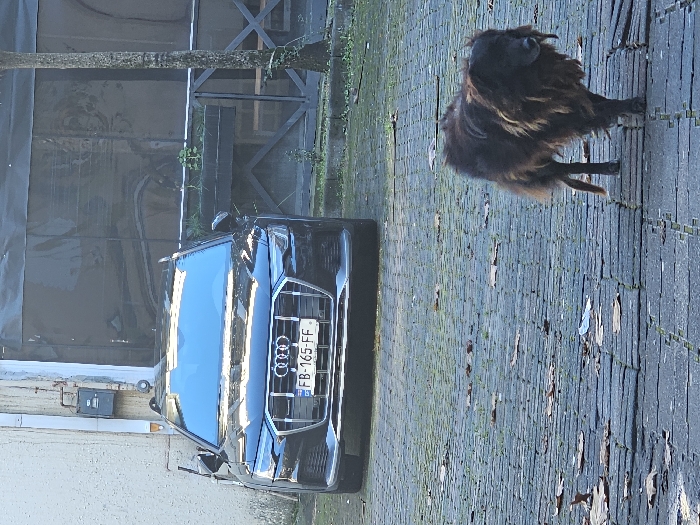 A black Audi Q8 SUV is parked, facing forward, on a paved surface in Batumi, Georgia. The vehicle's front license plate, "FB-165-FF," is clearly visible. To the left of the vehicle is a light-colored building wall with an attached electrical meter box. To the right, a dark commercial awning and a decorative fence with an 'X' pattern are visible, along with a planter box containing small green plants. A slender tree trunk stands further right. In the foreground, a scruffy, dark-furred dog with matted, lighter brown patches on its fur walks from right to left across a cobblestone-paved area. The pavement is strewn with dry leaves and minimal litter, with small patches of green vegetation growing between the pavers. No people are visible.