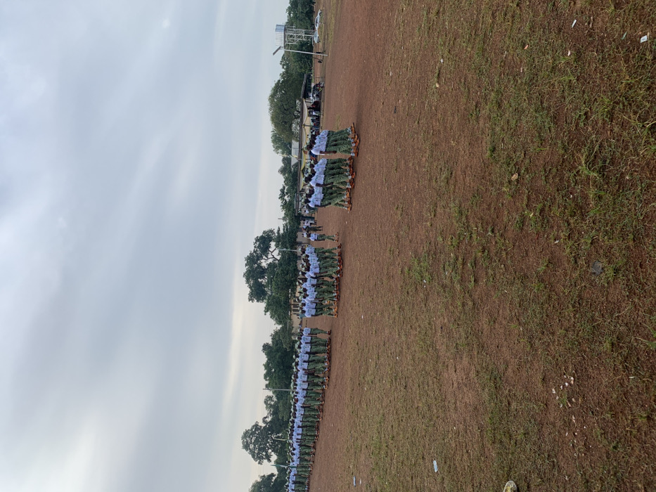 The scene depicts an outdoor gathering in Kubi A, Nigeria, taking place on a large, reddish-brown dirt field sparsely covered with green grass. The sky is uniformly overcast with light grey clouds. In the background, numerous green trees line the horizon, interspersed with low-lying buildings, a prominent water tower with a white tank on a metallic frame, and a tall pole equipped with a solar panel and light fixture. Several vehicles are parked further in the distant background to the right. A large group of approximately 100-150 individuals, primarily young adults, are organized into multiple parallel lines across the field. They are uniformly dressed in what appears to be the National Youth Service Corps (NYSC) attire, consisting of white short-sleeved shirts, green trousers, white caps, and brown footwear. The individuals are positioned in structured formations, with the longest line extending from the mid-ground on the left towards the background, and another distinct formation of shorter lines positioned closer to the foreground on the right. Their posture suggests they are either standing at attention or engaged in a drill. One individual, distinctively dressed in a camouflage uniform, stands between the two main formations, possibly supervising or instructing. There are no clear discernible interactions between individuals, as they maintain their disciplined formations.