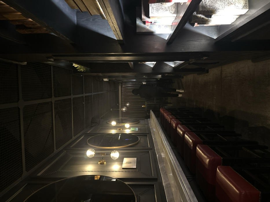 A dimly lit, narrow space featuring a row of red leather seating against a textured wall. Circular tables with lamps are attached to the opposite wall, which is adorned with a grid pattern. At the far end, a figure in dark clothing stands near steps leading upwards. The ceiling reveals a wooden structure and bookshelves above.
