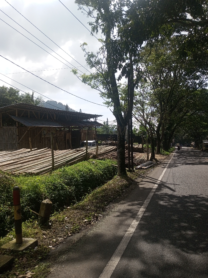 This image depicts a roadside scene in Kandapola, Sri Lanka, captured during daylight hours. The foreground features an asphalt road with a solid white line on its left edge, traversed by long shadows from adjacent trees. To the left of the road, a dense strip of green vegetation fills a ditch, behind which a short, black, yellow, and red painted marker post stands. Further left, a large, two-story structure constructed predominantly from bamboo poles and featuring a corrugated metal roof is visible. Extensive piles of cut bamboo poles are horizontally stacked in front of this structure. A white van is partially visible behind these bamboo piles, adjacent to the bamboo structure. The right side of the road is lined with a series of tall, leafy trees, forming a partial canopy further down. In the mid-distance on the road, a motorcycle with at least one rider is traveling away from the viewer. The background reveals undulating hills or mountains beneath a partially cloudy sky, with multiple overhead power lines stretching across the upper frame. No specific interactions between individuals are discernible.