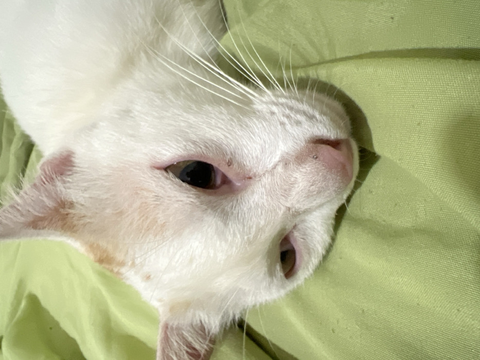 - "A white domestic cat with faint orange-brown markings on its head is depicted in a close-up, lying on a light green fabric surface" by FM-gZMgt2, licensed under CC BY 4.0