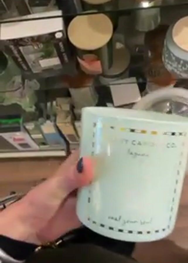 someone holding a light blue candle with a glass lid in a store. The candle has a seashell, a small piece of wood, and three faux pearls embedded in the wax. The label reads "Sydney Candle Co. Laguna. Heal your soul." The camera zooms in to show the candle's contents. The store shelf behind the candle displays other candles and items.