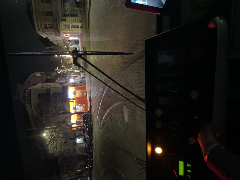 - "The image presents a nighttime, frontal view from the interior of a vehicle, specifically from the driver's perspective of what appears to be a tram, in the city of Sofia, Bulgaria" by FM-5fMa02, licensed under CC BY 4.0
