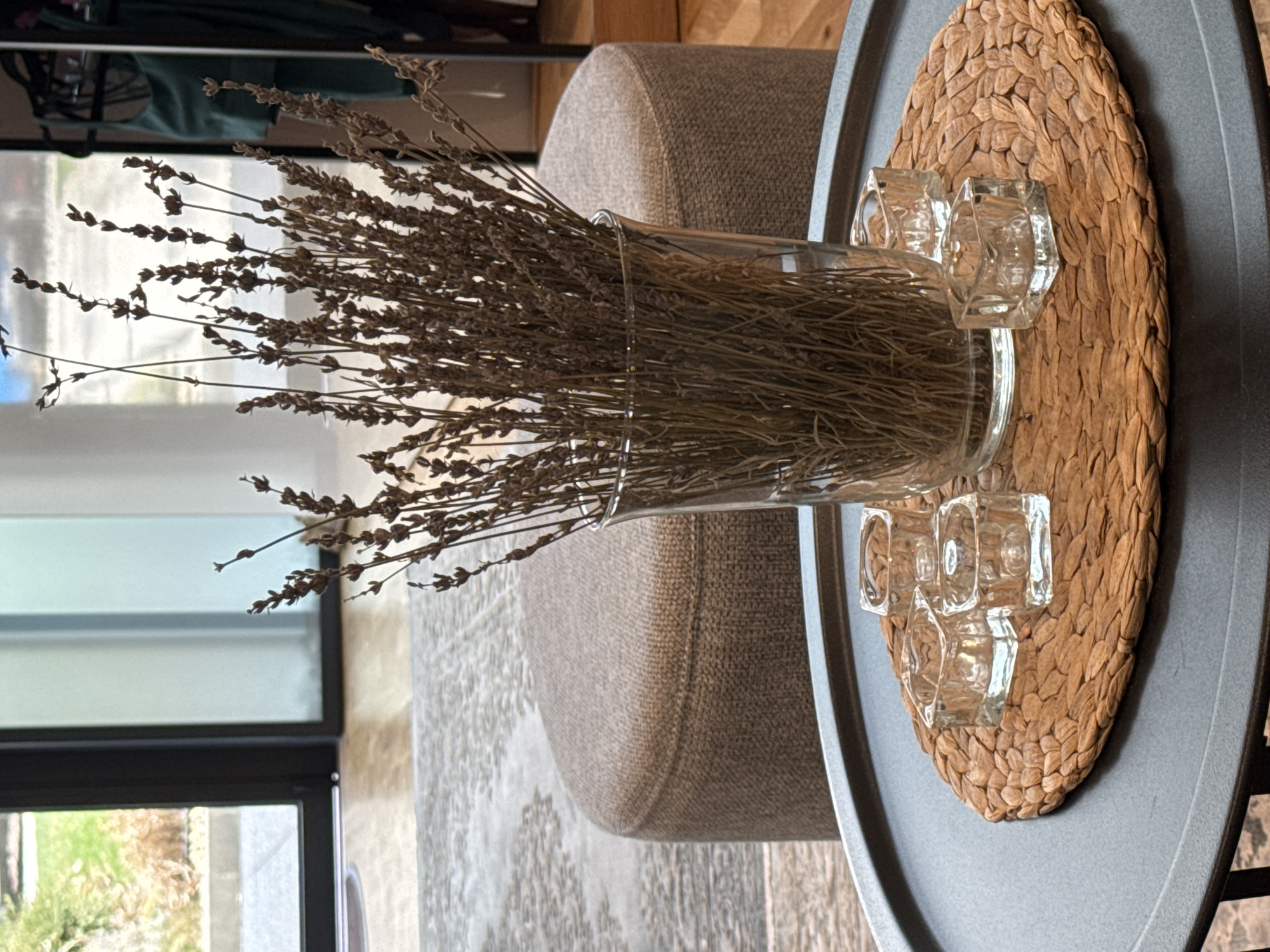 The image depicts an indoor scene in Sofia, Bulgaria, focused on a still life arrangement on a dark-colored, round coffee table. On the table, a round, woven natural fiber placemat serves as a base for a clear cylindrical glass vase filled with numerous dried, brown lavender stalks. Five small, clear, square glass votive candle holders are positioned around the base of the vase on the placemat. In the midground, a large, round, light brown upholstered ottoman with a textured fabric is visible, resting on a light-colored, patterned rug. The background features large glass doors or windows with dark frames. Through the left opening, outdoor greenery and a paved surface are discernible. The right opening reflects interior elements, including a clothing rack holding garments, with a teal top prominently reflected.