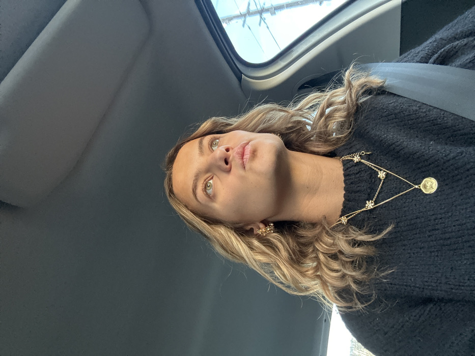 - "A woman with blonde curly hair sits in a car, wearing a black sweater and a gold necklace with a coin pendant" by FM-Mqmx03, licensed under CC BY 4.0