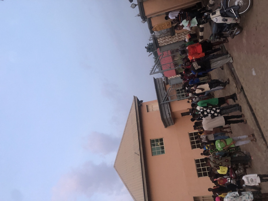 This image depicts a crowded scene on a paved outdoor area in Isiamigbo, Nigeria, during what appears to be late afternoon or early evening