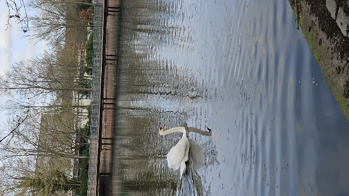This image captures a park-like scene in Dusseldorf, Germany. A large, white mute swan is swimming from left to right across a body of water, likely a canal or pond. The swan's reflection is visible below it, and it generates a small wake. The water surface exhibits ripples and scattered organic debris. In the mid-ground, a pedestrian bridge with dark pilings and light-colored, ornate metal railings spans the water. Beyond the bridge, numerous deciduous trees, largely bare, line the far bank. Buildings of various sizes are visible through and above these trees in the background, indicating an urban or suburban setting. A smaller, dark avian subject is present on the water near the bridge in the background. The sky is partially overcast. The vantage point is from a low bank, with a moss-covered concrete or stone edge visible in the bottom right foreground.