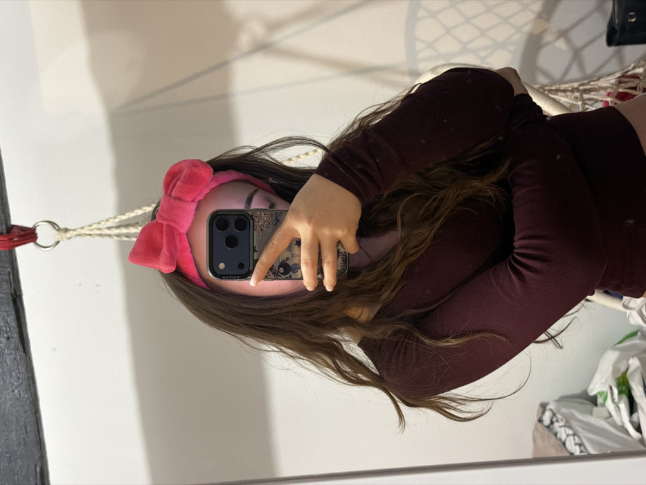 A woman in a maroon long-sleeve top is taking a mirror selfie. She has long, wavy brown hair and is wearing a pink bow headband. She's holding a smartphone with a patterned case in her hand, partially covering her face. The background includes a white wall and parts of a hanging macrame chair. The overall impression is casual and self-portrait.