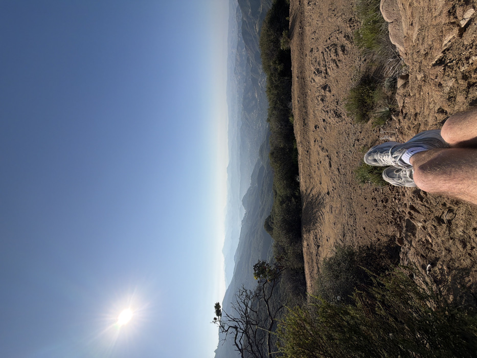 This image depicts a panoramic view from a high vantage point within the Unincorporated Santa Monica Mountains, United States of America, on a clear, sunny day. The scene is dominated by a bright blue sky, with a radiant sun positioned in the upper left quadrant. The mid-ground and background reveal numerous layers of rolling mountains and hills, densely covered with green and brown vegetation, receding into a hazy, blue-tinged horizon. A distant urban or suburban development is visible within the valley below the mountains. In the immediate foreground, the lower legs and feet of an individual are visible, resting on dry, reddish-brown earth mixed with small rocks and sparse, low-lying scrub brush. The person wears light-grey or white athletic shoes with white socks. Their bare legs are visible, suggesting a relaxed posture while observing the expansive landscape.