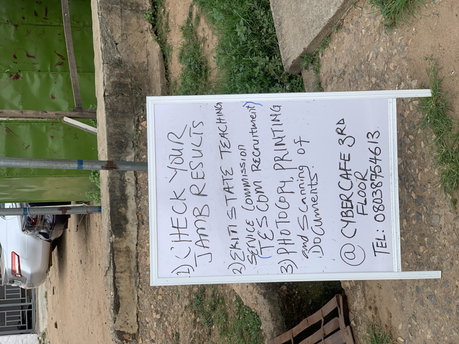 white board sign with black marker handwriting, positioned on a dirt path, at the location of Latitude: 7.252, Longitude: 5.199 in Ondo, Nigeria. The sign advertises the services of a cyber cafe, located on the 3rd floor, with a phone number listed for contact. The sign lists three services: 1) Checking JAMB results, 2) Ekiti State Teaching Service (Commission) TES COM Recruitment, 3) Photocopy, printing, and scanning of documents. The sign is leaning against a low wall, partially obscured by green grass. The background shows a green painted metal shed and a sliver car parked on a dirt driveway. The sign appears to be aimed at pedestrians walking along the path.