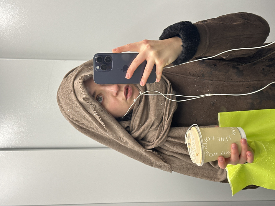 In Moscow, Russia, a female individual is captured in a mirror selfie, focusing from the upper torso upwards. She wears a brown or beige textured scarf covering her head and neck, adorned with visible specks of what appears to be snow or sleet. Her eyes are wide, and her mouth is slightly open. She is dressed in a dark brown, possibly suede, jacket with a black fur lining visible on the cuff of her right arm. White wired earbuds are connected to her left ear. In her right hand, she holds a dark-colored iPhone with a triple-lens camera system, partially obscuring her face as she photographs her reflection. In her left hand, she holds a light beige disposable coffee cup with a clear plastic lid and a visible stirrer, also showing small white particles. Below the cup, a portion of a wet, bright neon green plastic bag is visible. The background consists of plain light gray or white wall panels, indicating an indoor setting.