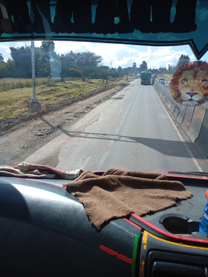 The image presents a forward-facing view from inside a vehicle, likely a truck or bus, onto a road within Molo ward, Kenya