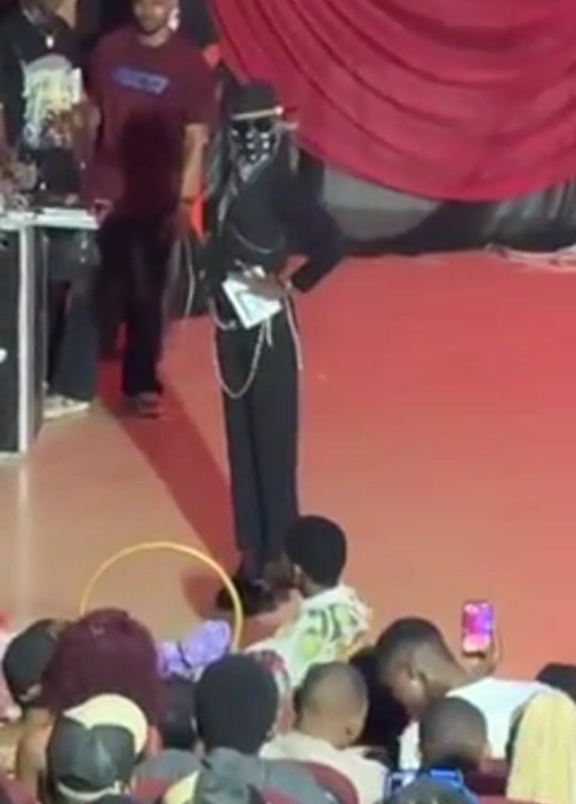 A person is seen walking on a red stage, modeling for a fashion show. The individual is wearing a black outfit with a hat and a patterned scarf covering the face. A number "13" is visible on a tag attached to the clothing. They are adorned with a chain and belt. The stage is well-lit, and there's a red curtain in the background. A group of people sit in the foreground, watching the show and taking pictures with their phones. A small hula hoop lies on the ground by their feet. More people can be seen standing behind the stage. A DJ setup with a banner saying "IZZY" can be seen stage left.