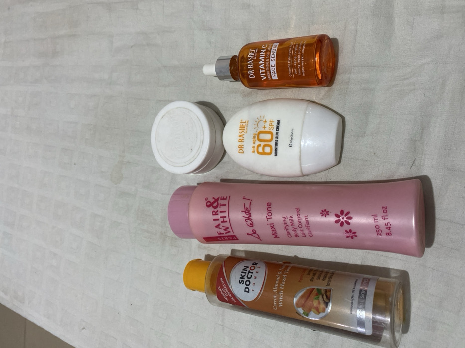 The image displays five cosmetic products arranged on a light-colored, textured fabric surface in Odo Ona, Nigeria. From left to right: a transparent bottle of "SKIN DOCTOR TONER" (Carrot, Almond & Witch Hazel) with a yellow cap, containing an orange liquid; a pink bottle of "FAIR & WHITE So White! Maxi Tone Clarifying Body Milk" (250 ml); a white circular jar with a lid; a white egg-shaped bottle of "DR. RASHEL Anti-aging 60 SPF PA+++ Moisture Sun Cream" (60g); and an amber dropper bottle of "DR. RASHEL VITAMIN C BRIGHTENING & ANTI-AGING FACE SERUM" containing an orange liquid. The fabric surface exhibits minor wrinkles and light stains. No individuals or active interactions are present.