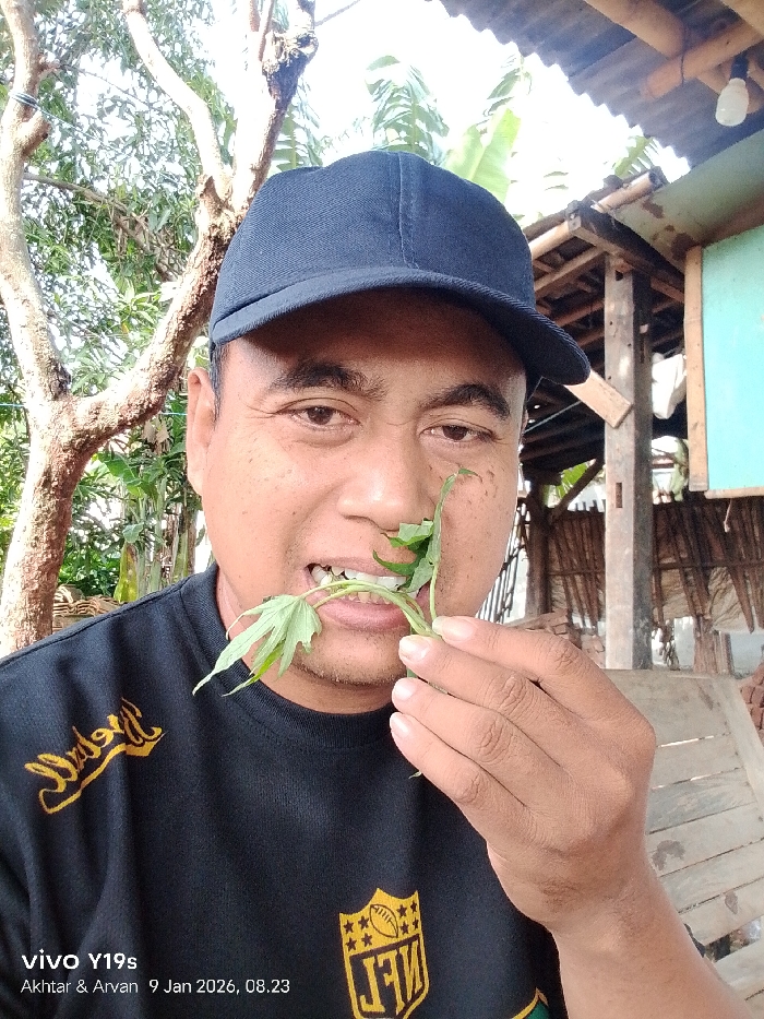 - "A man wearing a black t-shirt and a dark blue cap is outdoors, holding a leafy green plant to his mouth" by FM-bXIMf1, licensed under CC BY 4.0