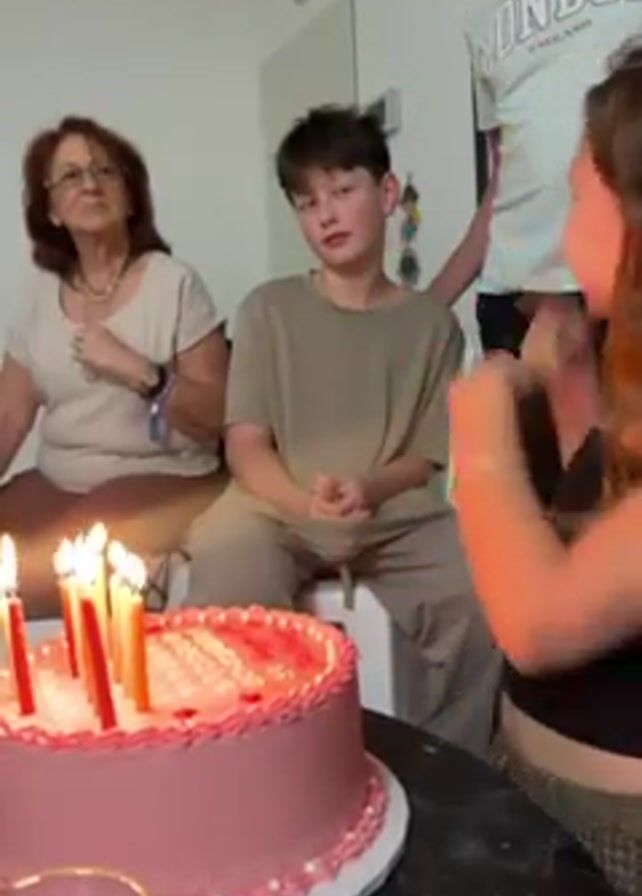 Here's a concise description of the video: A young girl wearing a tiara blows out candles on a pink birthday cake. She is standing at a table in a room with three other people watching her. There's an older woman to the left, a boy sitting behind the table, and a man standing behind the boy. The cake has several lit candles on top. The room appears to be indoors, with simple décor.