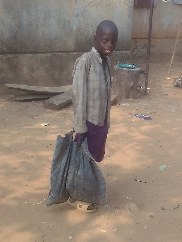 An image taken in Ajaokuta, Nigeria, depicts a young, dark-skinned male child standing outdoors on reddish-brown dirt ground. He possesses a shaved head and is facing the viewer with a slight smile, revealing his teeth. The child wears a light-colored, long-sleeved plaid shirt over purple trousers or shorts, and light-colored, open-toed sandals. He holds a large, dark grey or black plastic bag, appearing full, in his left hand. The background features a light grey concrete or cinder block wall, partially obscured, with faded red graffiti visible, including the words "I LOVE THIS BOY." To the child's left, two roughly cut wooden planks lie on the ground. To his right, a vertical tree stump serves as a surface, topped with a green plastic bowl or container and a small, unidentifiable object. A slender metal pole or stick is visible vertically behind the stump. The ground is sparsely covered with small leaves and minor debris. The scene is illuminated by natural daylight.