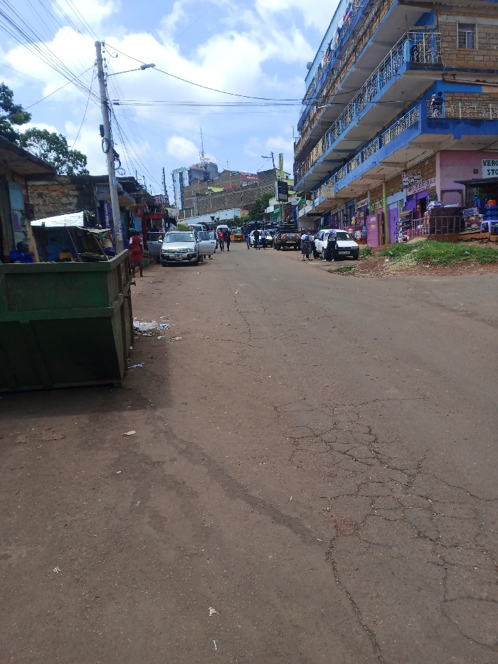 The image displays an urban street scene in Murang'a, Kenya, under a partly cloudy sky