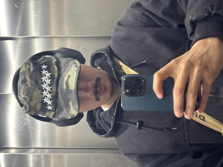 A person takes a selfie in a reflective metal space. The individual wears a camo-patterned cap adorned with white stars, headphones, and a dark jacket. A strap, possibly for a bag, is visible across their body. They are holding a dark blue phone, presumably to capture the image. The subject's face is partially obscured by the hat, but a mustache is visible.