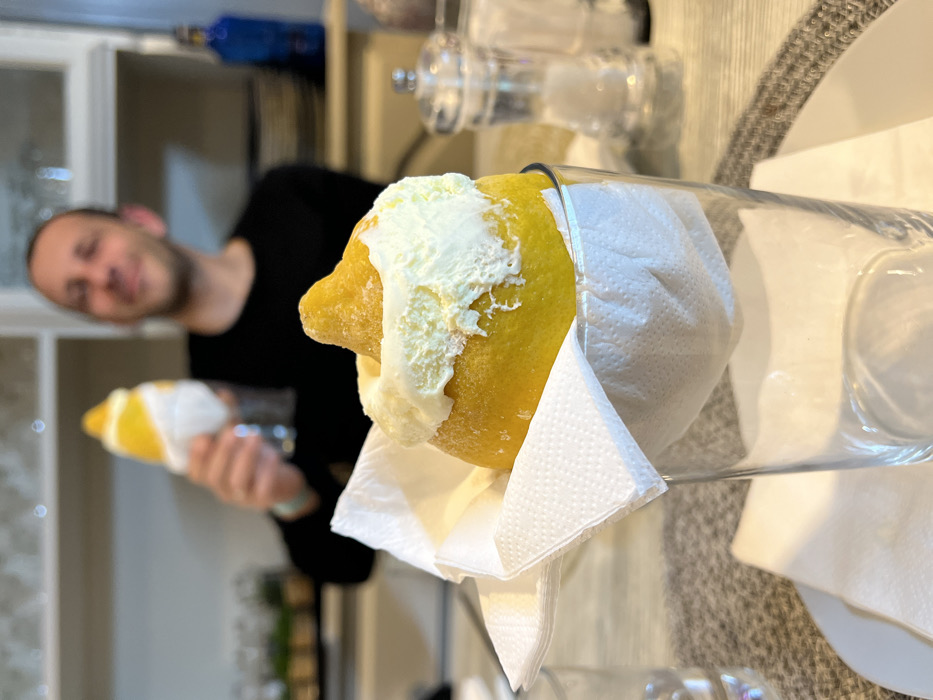 - "The image displays a close-up, front-facing view of a dessert consisting of a hollowed-out lemon filled with yellow sorbet, topped with a ring of white cream or meringue" by FM-f117B3, licensed under CC BY 4.0