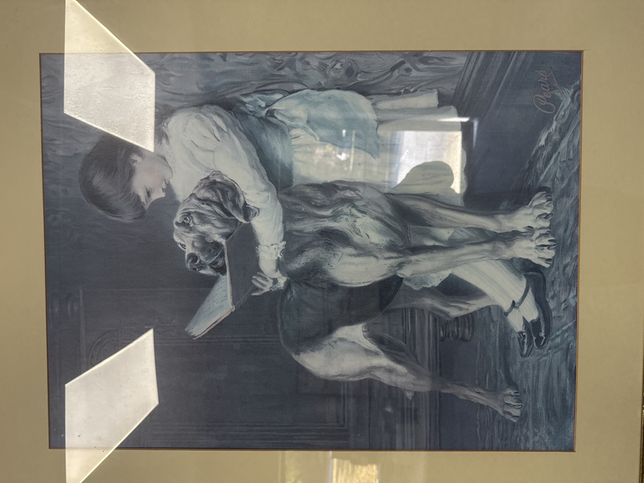 A framed monochromatic artwork, signed "Pears" in the lower right corner, is photographed in Loganville, United States. The artwork depicts a young boy with short hair, wearing a white long-sleeved shirt, a sash or apron, and dark strapped shoes with white stockings. He holds an open book at chest height. A large, droopy-eared hound dog, resembling a Bloodhound, stands on its hind legs, resting its front paws on the boy's forearms, and appears to be looking at the open book. The background features dark ornate paneling or furniture on the left and a patterned wall on the right. The artwork is enclosed in a thin, light-colored frame. Significant glare from overhead or external light sources reflects off the protective glass, obscuring parts of the image, notably in the upper left and diagonally across the mid-right sections.