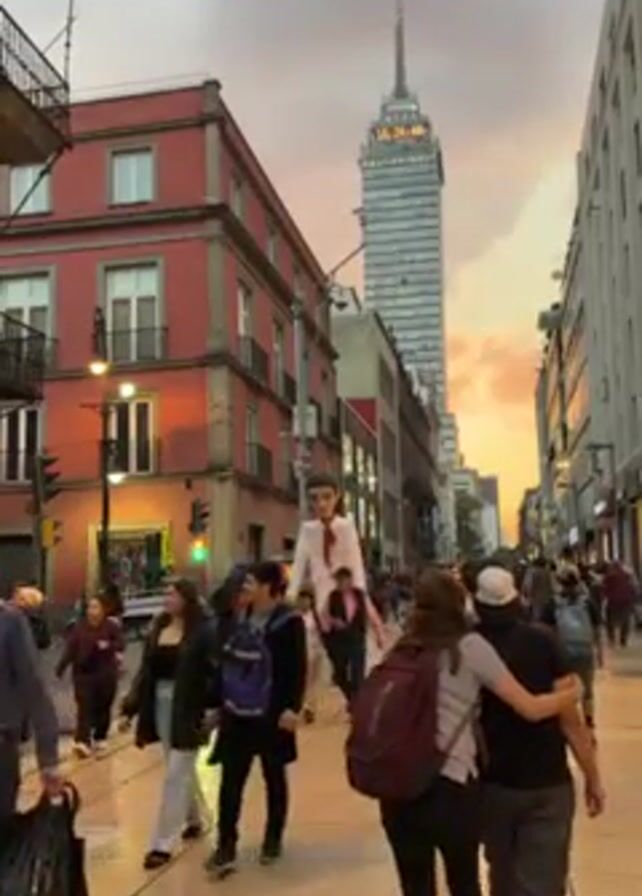 busy city street at dusk, possibly in Mexico City. The street is filled with pedestrians walking in both directions. Dominating the background is the prominent Torre Latinoamericana skyscraper. A giant puppet, dressed in what appears to be a white jacket and tie, is being carried through the crowd. The buildings lining the street are varied in color and design, with one distinctive pink building catching the eye. The sky is colored with the hues of sunset, creating a picturesque backdrop to the urban scene.