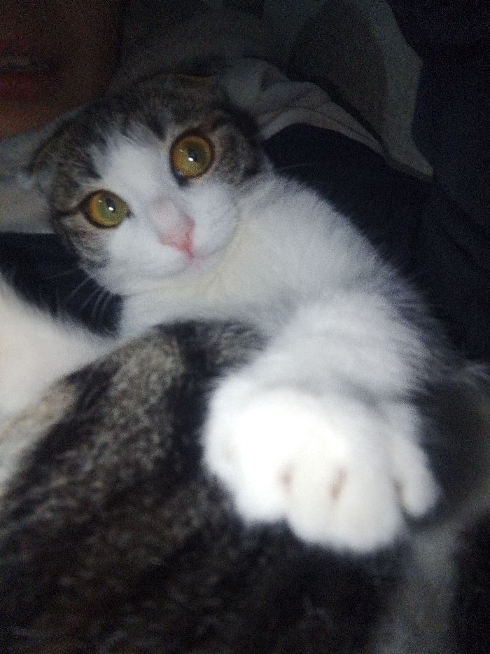 A domestic cat is depicted in a close-up, dimly lit, indoor setting. The cat, predominantly white with dark grey-brown tabby markings on its head and upper back, features large, round, green-yellow eyes and a pink nose. Its ears appear to be folded, consistent with a Scottish Fold breed. The cat's left front paw, white with visible pink toe pads, is extended towards the viewer and is slightly out of focus. A blurred, dark background, likely fabric or clothing, suggests the cat is resting on an individual or soft surface. A faint, out-of-focus human facial contour or body part is marginally visible in the upper left corner. No discernible details allow for the determination of a specific location within the city of Khujayli, Uzbekistan.