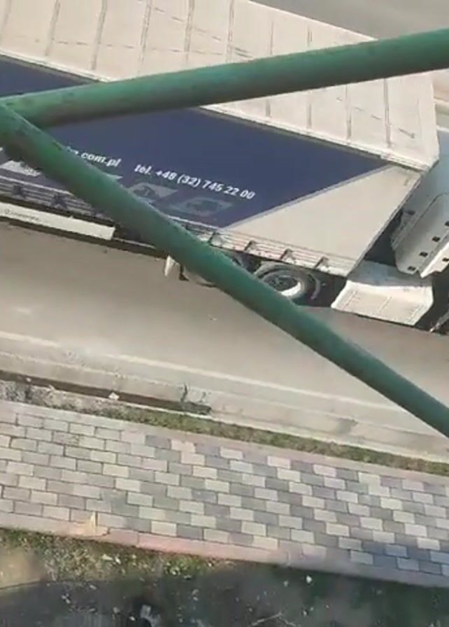 From an elevated, scaffold-like perspective, a white semi-truck with a dark blue trailer navigates a street intersection
