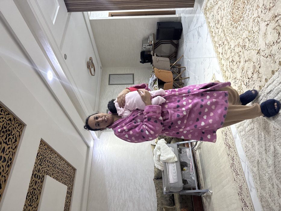 A woman in a pink robe and blue slippers stands in a room with a patterned rug. She holds a baby wrapped in pink fabric. Behind her is a baby changing station with folded white fabric. The room has white walls with decorative paneling and molding. In the background are furniture pieces and interior design elements.
