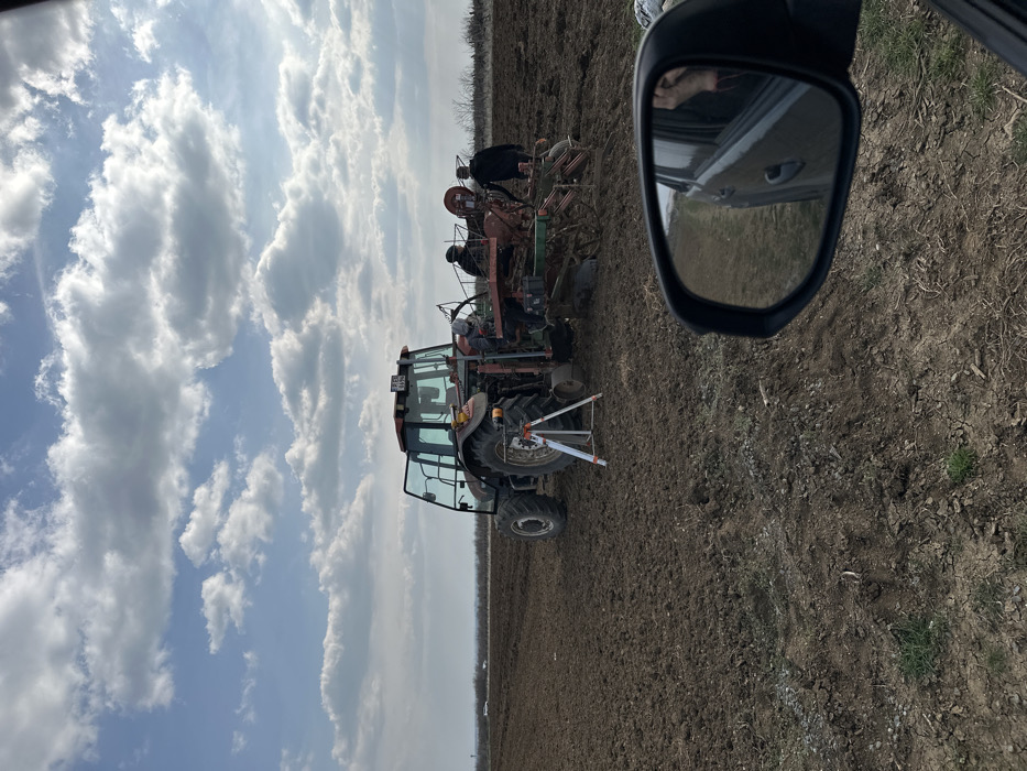 The image captures an agricultural field scene in Oriahovitsa, Bulgaria, under a partly cloudy sky. A dark-colored agricultural tractor, featuring a red-orange cab roof and a visible license plate "BP 1695 M", is positioned centrally on dark brown, tilled earth. The driver's side door of the tractor is open. Attached to the rear of the tractor is a multi-row agricultural implement, consisting of various mechanical components including hoppers and disc mechanisms. Three individuals are clustered around this rear implement, appearing to be inspecting or working on it. One individual is partially obscured by the tractor's structure. A white tripod with a red-and-white precision instrument stands on the ground adjacent to the tractor's rear left tire. In the foreground, the side mirror of a dark-colored vehicle is visible on the right, reflecting part of the vehicle's body and an arm. The distant horizon features a faint tree line, a road, and a vehicle on the far left.