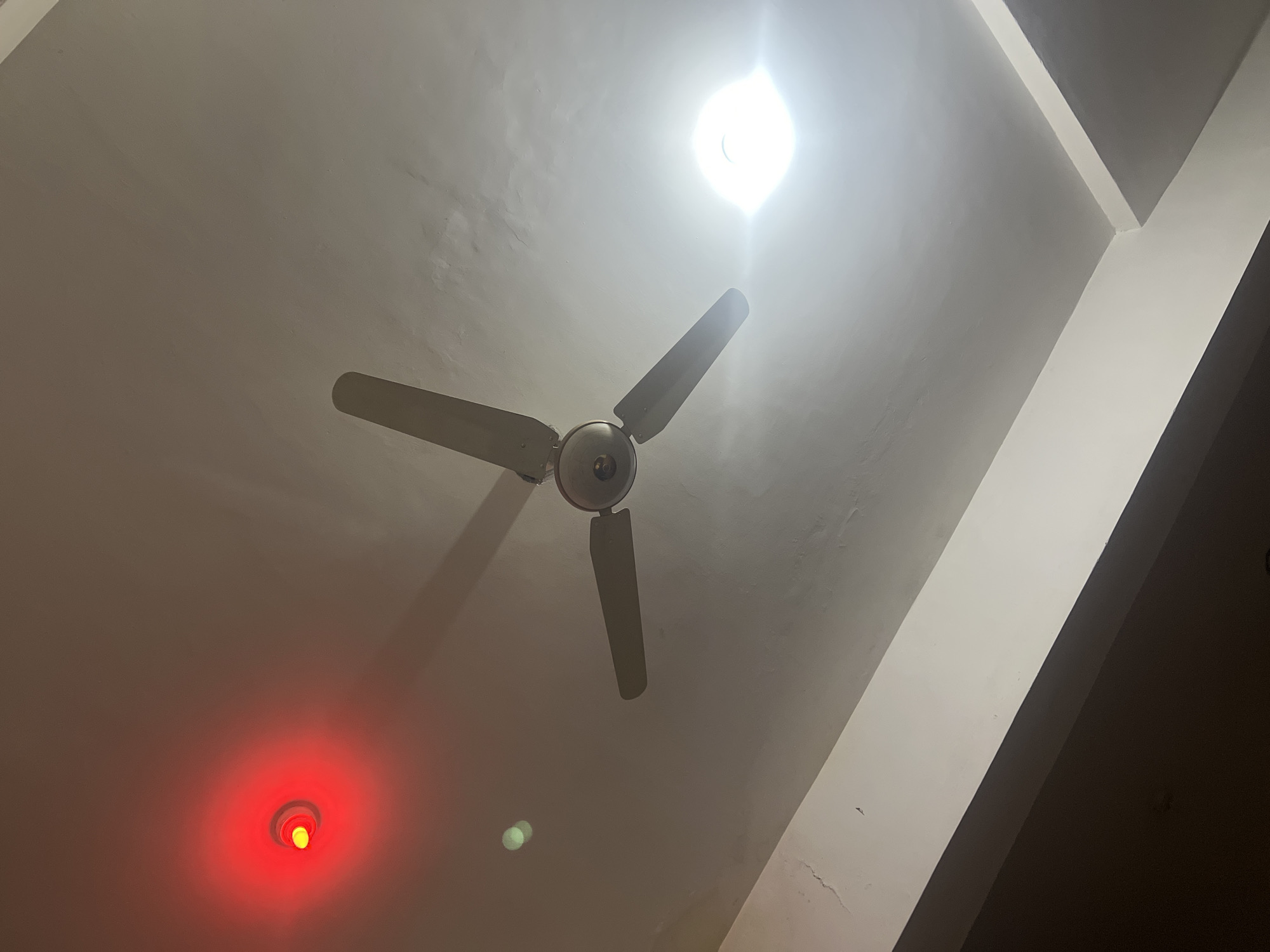 A low-angle shot shows a ceiling with a ceiling fan, a light fixture, and a fire alarm