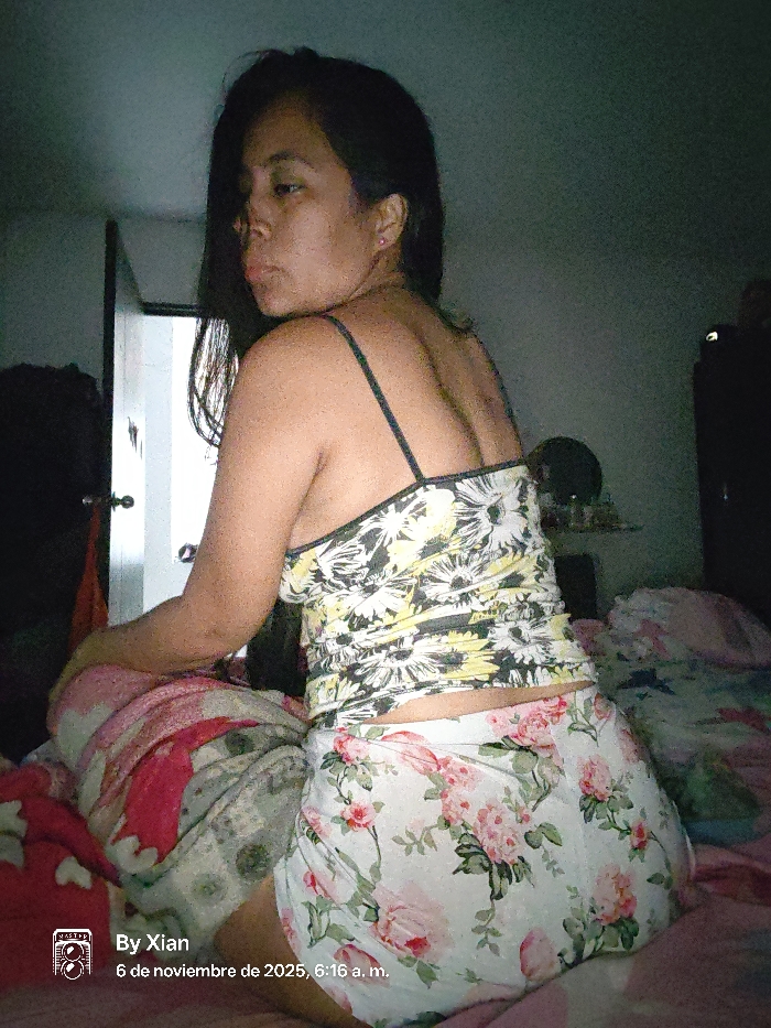 An indoor scene depicts a single individual, identified as female, seated on a bed. The subject is turned away from the camera, with her head rotated sharply to her right (viewer's left) to look back over her shoulder. She has dark hair and wears a floral-patterned spaghetti strap top (white, yellow, and black) and white shorts with a pink and green rose pattern. A small, reddish stud earring is visible in her left earlobe. The bed is covered with various patterned blankets or quilts in shades of pink, white, and gray. In the background, to the left, a white door with a silver doorknob is partially visible and slightly ajar. To the right, the background is dark and indistinct, with a faint circular object and what appears to be piled fabric or clothing. The walls are a dark greenish-gray. The image's timestamp indicates "6 de noviembre de 2025, 6:16 a. m." The specific location within the city of Cali, Colombia, is not discernible from the provided image.