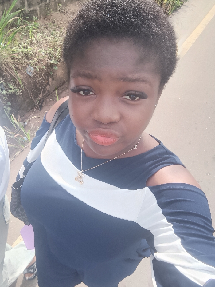 The image depicts a close-up, high-angle selfie of a dark-skinned female, positioned in what appears to be an outdoor urban or semi-urban setting, consistent with a location in Owerri, Nigeria