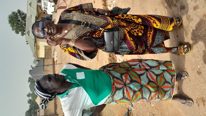 Two women stand outside on a dirt surface. One wears a colorful printed dress with black accents, gold bracelets, sunglasses, and sandals, carrying a black purse on a strap. The other is in a green and white top with a patterned skirt, wearing a head covering and simple sandals. They are positioned next to each other against a backdrop of buildings and trees under a bright sky.