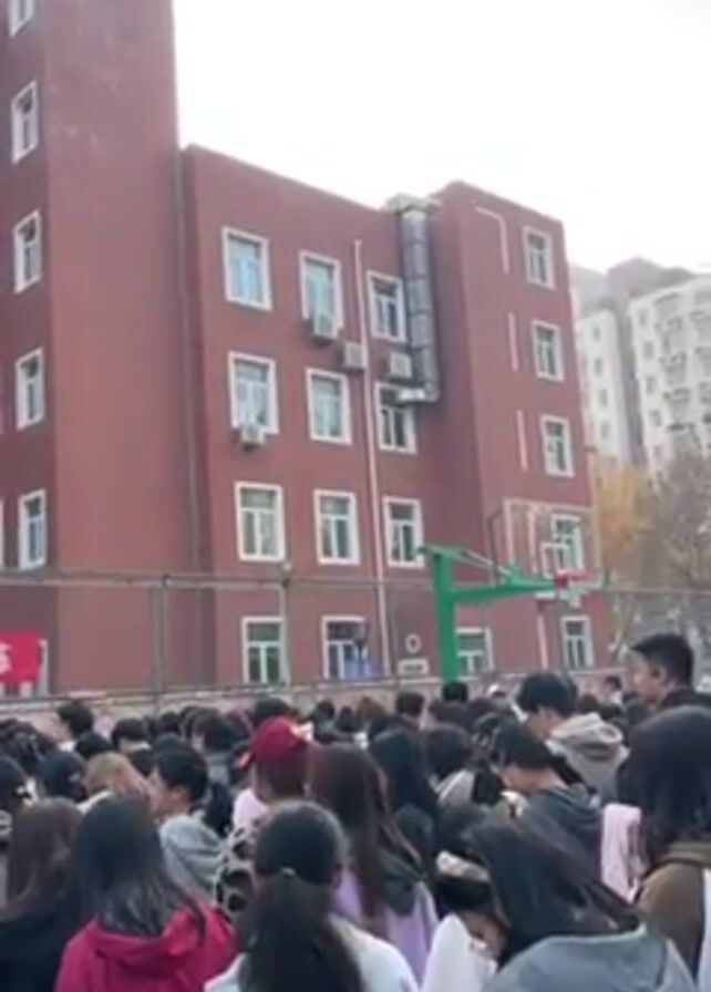 large group of people, likely students, standing in front of a red brick building. A banner in Chinese characters is strung across the building, indicating a fire evacuation drill. There's a basketball hoop in the foreground. The sky is overcast. The students are mostly facing the building.