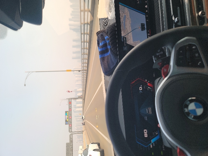 The interior of a car driving across a bridge is shown