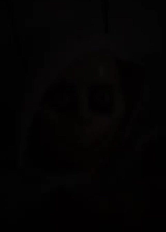 The video is a very dark shot that gradually illuminates a pale face with large, dark eyes and a thin, slightly upturned mouth
