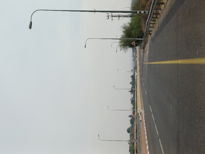 A roadside view shows a row of street lamps lining a highway. A yellow line marks the center of the road. A signpost with a triangular symbol is visible beside a guardrail. The sky is overcast. Trees and electrical poles are positioned along the side of the road.