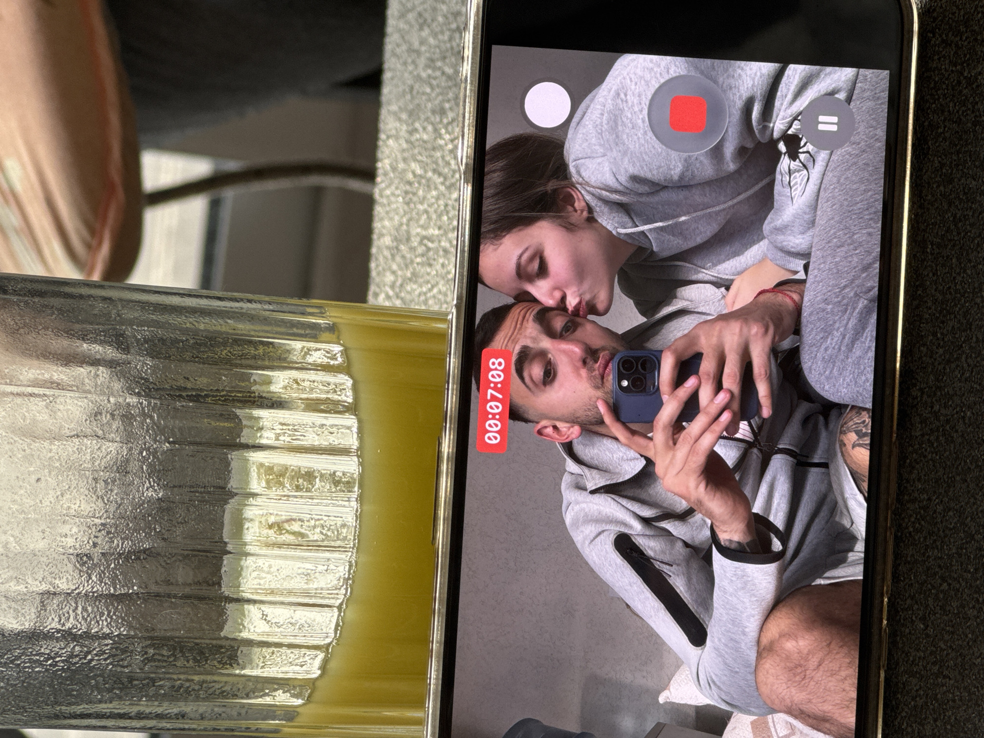 The image depicts a close-up of a smartphone screen displaying a recording interface. The recording is in progress (indicated by a red square icon and timer). The screen shows a young man and woman embracing and kissing while taking a selfie video. Both are wearing gray hoodies. The man is holding a blue smartphone. The background visible on the phone screen suggests an indoor environment, perhaps a home. To the left of the smartphone is a partially visible glass containing a yellow liquid, likely juice. The surface beneath the glass appears to be a textured, dark gray material. No details connect this scene to the city of Bulgarovo, Bulgaria.