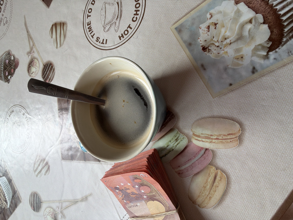 The scene, set in the city of Kazanlak, Bulgaria, depicts an overhead view of a table. The table is covered by a light-toned tablecloth featuring printed decorative confectionery and coffee motifs, including text that reads "IT'S TIME TO DRINK HOT CHOCOLATE" alongside a coffee cup graphic. In the upper-left quadrant, a bound stack of Euro banknotes, specifically 50 Euro denominations identifiable by their orange color and visible numbering ("50 EURO", partial serial number "567226"), is secured with light brown twine. Centrally positioned is a light blue ceramic cup containing a dark liquid, consistent with black coffee, exhibiting a light brown crema. A metal spoon, engraved with a steaming cup emblem, rests within the liquid. To the left and below the cup, several two-dimensional cutouts or prints resembling pastel-colored macarons (green, pink, beige) are arranged. In the lower-right area, a rectangular printed image or coaster displays a chocolate cupcake adorned with white whipped cream and sprinkled cocoa powder. No individuals are present in the image. The scene is uniformly illuminated.